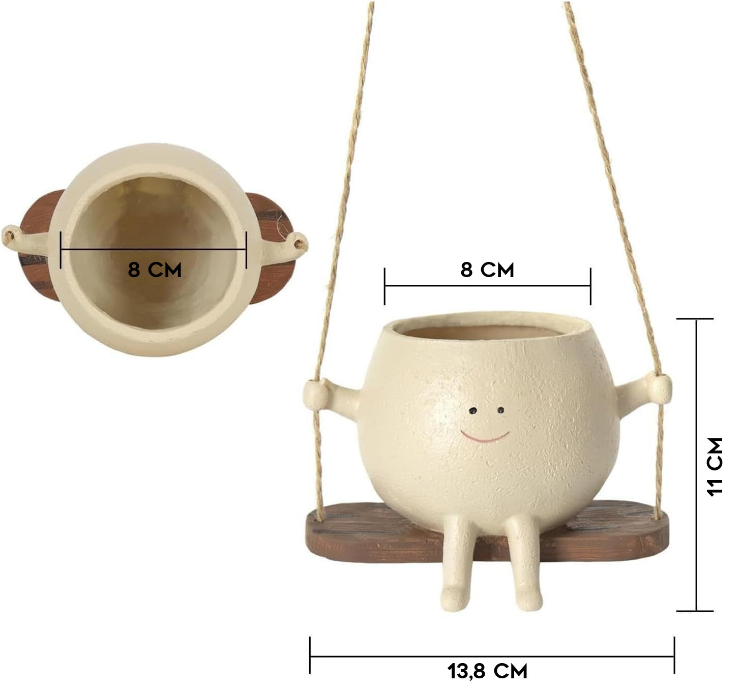 Skab en charmerende atmosfære i dit hjem med vores svingende plantevase! Dette unikke design kombinerer funktionalitet med legende æstetik og fremviser dine yndlingsplanter på en elegant måde. Plantevasen er solidt fastgjort til en smuk træsving, hvilket får det til at se ud, som om dine planter svæver i luften. Perfekt til at skabe en hyggelig og legende stemning i ethvert rum i dit hjem. Tilføj et strejf af naturlig skønhed og leg til dit hjem med vores svingende plantevase!