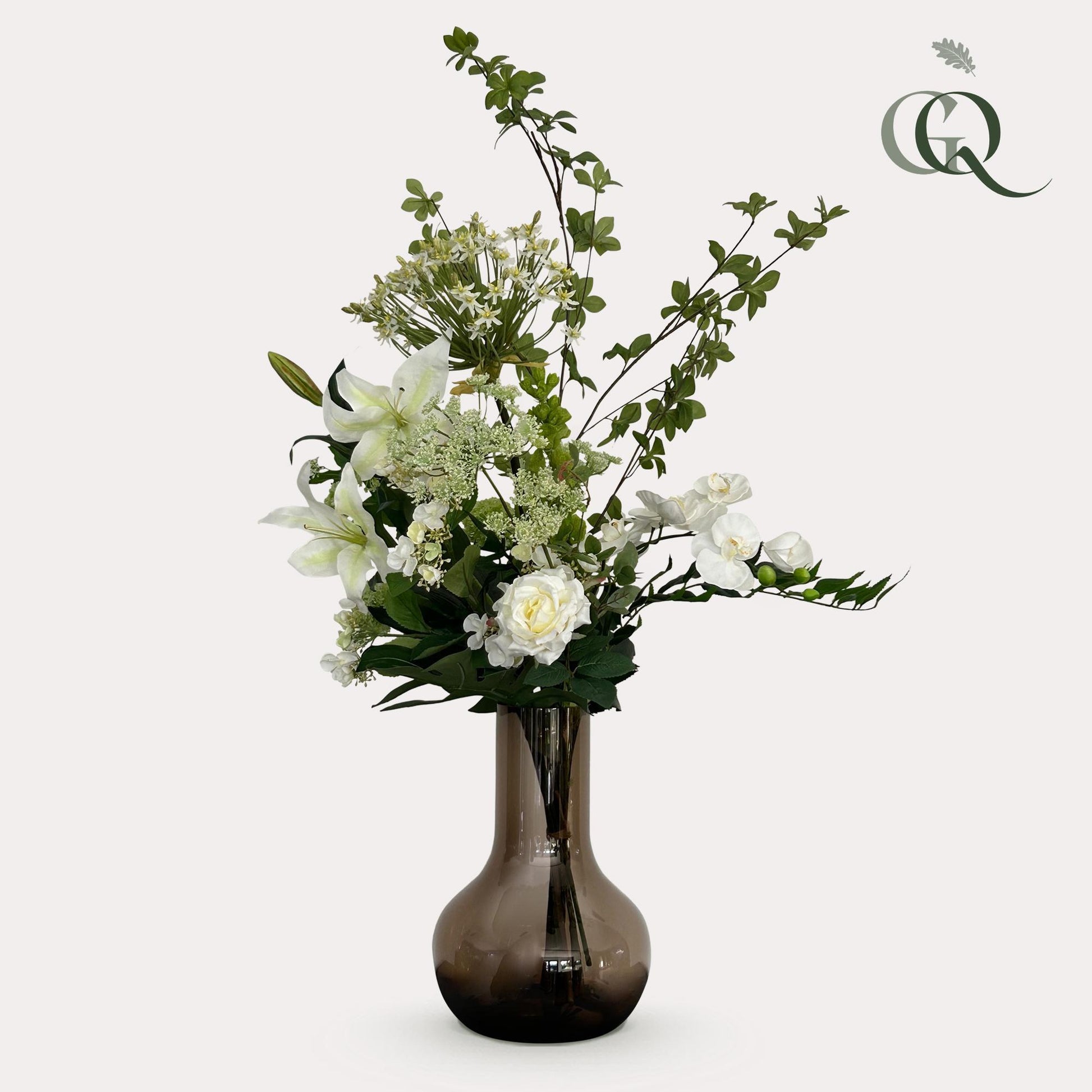 Lägg till en touch av sofistikering till din interiör med denna vackra konstbukett. Varje detalj är kärleksfullt sammansatt av våra erfarna florister som strävar efter perfektion. Dessa högpresterande konstgjorda blommor behåller sin skönhet och fräschör utan behov av underhåll. Skapa en atmosfär av tidlös elegans på ditt matbord, byrå, fönsterbräda, sminkbord eller skrivbord med denna underhållsfria bukett. Låt dig förtrollas av det realistiska utseendet och njut av den bestående skönheten hos konstgjorda blommor i ditt hem.
